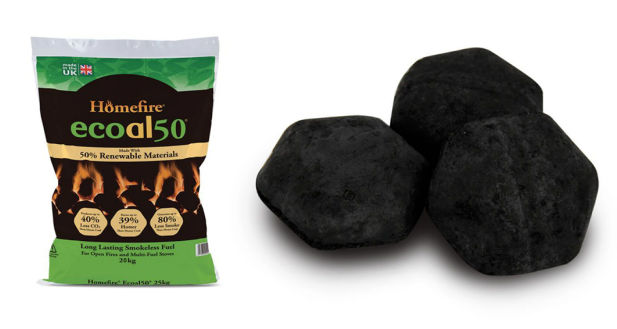 Ecoal50 25kg £20.50 . Made in the UK by combining 50% renewable plant material with high quality Welsh mined anthracite, Ecoal50 is a revolutionary smokeless fuel that burns longer and hotter than house coal, whilst at the same time producing much less smoke and carbon dioxide. Ecoal50 has been designed for use on open fires and multi-fuel stoves, where its larger hexagonal shape (75 x 40mm) promotes air flow resulting in attractive flames and loads of heat. Thanks to its high and sustained heat output, burning Ecoal50 can work out cheaper than burning house coal or kiln dried firewood, because whilst individual bags are more expensive, you use less for the same heat.